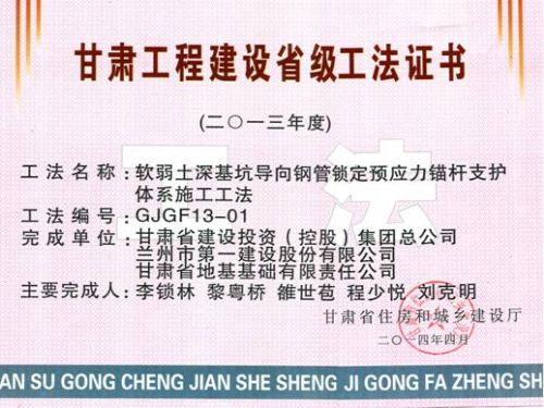 近日,由建設(shè)公司技術(shù)質(zhì)量部主編申報(bào)的《軟弱土深基坑導(dǎo)向鋼管鎖定預(yù)應(yīng)力錨桿支護(hù)體系施工工法》榮獲“2013年度甘肅工程建設(shè)省級(jí)工法”。