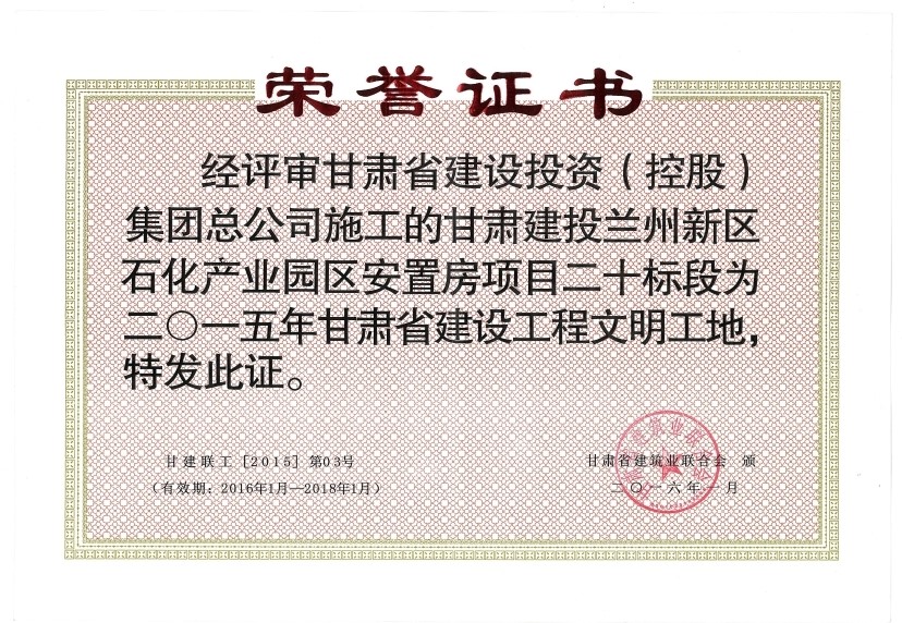 蘭州新區(qū)石化產(chǎn)業(yè)園區(qū)安置房項(xiàng)目二十標(biāo)段榮獲2015年省級(jí)文明工地