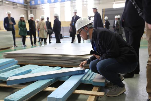 圖為與會(huì)人員在考察甘肅建投廠房材料。